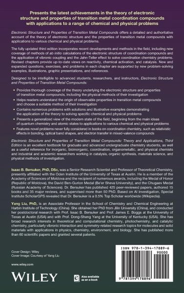Presents the latest achievements in the theory of electronic structure and properties of transition metal coordination compounds with applications to a range of chemical and physical problems Electronic Structure and Properties of Transition Metal Compounds offers a detailed and authoritative account of the theory of electronic structure and the properties of transition metal compounds with applications to various chemical and physical problems. The fully updated third edition incorporates recent developments and methods in the field, including new coverage of methods of ab initio calculations of the electronic structure of coordination compounds and the application of vibronic coupling and the Jahn-Teller effect to solve coordination chemistry problems. Revised chapters provide up-to-date views on reactivity, chemical activation, and catalysis. New and expanded questions, exercises, and problems in each chapter are supported by new problem-solving examples, illustrations, graphic presentations, and references. Designed to be intelligible to advanced students, researchers, and instructors, Electronic Structure and Properties of Transition Metal Compounds: * Provides thorough coverage of the theory underlying the electronic structure and properties of transition metal compounds, including the physical methods of their investigation * Helps readers understand the origin of observable properties in transition metal compounds and choose a suitable method of their investigation * Contains numerous problems with solutions and illustrative examples demonstrating the application of the theory to solving specific chemical and physical problems * Presents a generalized view of the modern state of the field, beginning from the main ideas of quantum chemistry and atomic states to applications to various chemical and physical problems * Features novel problems never fully considered in books on coordination chemistry, such as relativistic effects in bonding, optical band shapes, and electron transfer in mixed-valence compounds Electronic Structure and Properties of Transition Metal Compounds: Theory and Applications, Third Edition is an excellent textbook for graduate and advanced undergraduate chemistry students, as well as a useful reference for inorganic, bioinorganic, coordination, organometallic, and physical chemists and industrial and academic researchers working in catalysis, organic synthesis, materials science, and physical methods of investigation.