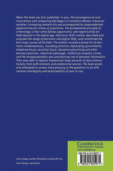 When this book was first published in 2001, the convergence of communications and computing had begun to transform Western industrial societies. Increasing connectivity was accompanied by unprecedented opportunities for crimes of acquisition. The fundamental principle of criminology is that crime follows opportunity, and opportunities for theft abound in the digital age. Electronic Theft named, described and analysed the range of electronic and digital theft, and constituted the first major survey of the field. The authors covered a broad list of electronic misdemeanours, including extortion, defrauding governments, telephone fraud, securities fraud, deceptive advertising and other business practices, industrial espionage, intellectual property crimes, and the misappropriation and unauthorised use of personal information. They were able to capture impressively large amounts of data internationally from both scholarly and professional sources. The book posed and attempted to answer some of the pressing questions to do with national sovereignty and enforceability of laws in 2001.