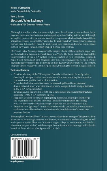 "In this well-written, concise volume Stearns ... details both the technological and organizational challenges that Visa had to overcome in order to link merchants and financial institutions into a seamless worldwide electronic network. ... a valuable contribution to not only the history of technology, but the broader fields of financial, consumer, and business history. ... Among the many strengths of this book is its crystal clear writing style. ... Overall, Electronic Value Exchange will be of interest to a wide variety of scholars." (David L. Mason, EH, February, 2012)