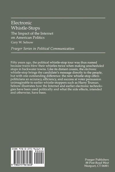 Fifty years ago, the political whistle-stop tour was thus named because trains blew their whistles twice when making unscheduled stops in backwater towns. Like its distant cousin, the electronic whistle-stop brings the candidate's message directly to the people, but with one outstanding difference: the new whistle-stop offers politicians an accuracy, efficiency, and success at voter persuasian unimaginable to by earlier whistle-stoppers such as Harry Truman. As Selnow shows, American political campaigns have an extraordinary affinity for electronic devices. They have seized upon electronic bulletin boards, home pages, and electronic libraries. Since political campaigns are communication campaigns, Selnow concludes that candidates who successfully inform, persuade, enlighten, and even confuse voters will win votes. Selnow also examines the debate between those who argue that new technologies have improved efficiency and those who believe that the innovations have affected society in other ways. Scholars and students of American political communication must read this book; the lively style will also make it exciting reading for anyone interested in this new political tool.