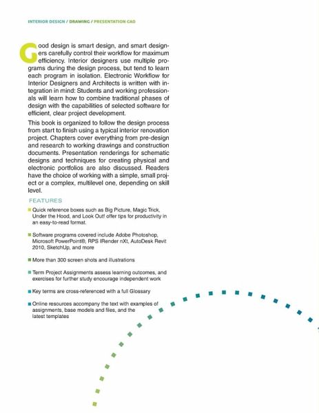 Good design is smart design, and smart designers carefully control their workflow for maximum efficiency. Interior designers use multiple programs during the design process, but tend to learn each program in isolation. Electronic Workflow for Interior Designers and Architects is written with integration in mind: students and working professionals will learn how to combine traditional phases of design with the capabilities of selected software for efficient, clear project development. This book is organized to follow the design process from start to finish using a typical interior renovation project. Chapters cover everything from predesign and research to working drawings and construction documents. Presentation renderings for schematic designs and techniques for creating physical and electronic portfolios are also discussed. Readers have the choice of working with a simple, small project or a complex, multilevel one, depending on skill level.