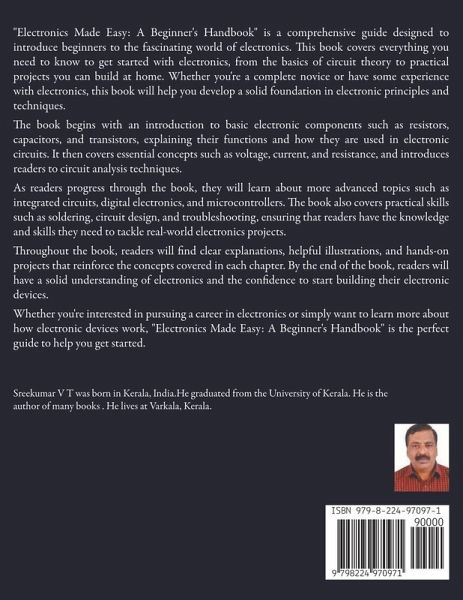 "Electronics Made Easy: A Beginner's Handbook" is a comprehensive guide designed to introduce beginners to the fascinating world of electronics. This book covers everything you need to know to get started with electronics, from the basics of circuit theory to practical projects you can build at home. Whether you're a complete novice or have some experience with electronics, this book will help you develop a solid foundation in electronic principles and techniques. The book begins with an introduction to basic electronic components such as resistors, capacitors, and transistors, explaining their functions and how they are used in electronic circuits. It then covers essential concepts such as voltage, current, and resistance, and introduces readers to circuit analysis techniques. As readers progress through the book, they will learn about more advanced topics such as integrated circuits, digital electronics, and microcontrollers. The book also covers practical skills such as soldering, circuit design, and troubleshooting, ensuring that readers have the knowledge and skills they need to tackle real-world electronics projects. Throughout the book, readers will find clear explanations, helpful illustrations, and hands-on projects that reinforce the concepts covered in each chapter. By the end of the book, readers will have a solid understanding of electronics and the confidence to start building their electronic devices. Whether you're interested in pursuing a career in electronics or simply want to learn more about how electronic devices work, "Electronics Made Easy: A Beginner's Handbook" is the perfect guide to help you get started.