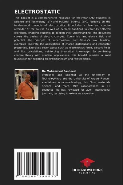 This booklet is a comprehensive resource for first-year LMD students in Science and Technology (ST) and Material Science (SM), focusing on the fundamental concepts of electrostatics. It includes a clear and concise reminder of the course as well as detailed solutions to carefully selected exercises, enabling students to deepen their understanding. The document covers the basics of electric charges, Coulomb's law, electric field and potential, the principle of superposition, and Gauss's law. Practical examples illustrate the applications of charge distributions and conductor properties. Exercises cover topics such as electrostatic force, electric fields and flux calculations, reinforcing theoretical knowledge. By combining concise theory with practical applications, this booklet provides a solid foundation for exploring electromagnetism and related fields.