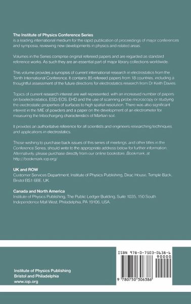 Preface. Bill Bright memorial lecture: Electrostatics - Then, now and maybe (D K Davies). Section A. Fundamental physics (10 papers). Section B. Bioelectrostatics. (7 papers). Section C. Atomization and EHD. (17 papers). Hop topic discussion. MECA electrometer: initial calibration experiments (M Buehler, L-J Cheng, O Orient, M Thelen, R Gompf, J Baliss, R Rauwerdink). Section D. Hazards (8 papers). Section E. Applications and processing. (13 papers). Section F. Materials evaluation and applications. (6 papers). Section G. ESD/EOS. (4 papers). Section H. Scanning probe microscopy. (7 papers). Section I. Atmospheric electrostatics and environmental aspects. (4 papers). Section J. Instrumentation. (7 papers). Author index.
