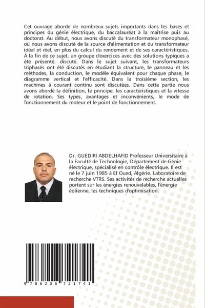 Cet ouvrage aborde de nombreux sujets importants dans les bases et principes du génie électrique, du baccalauréat à la maîtrise puis au doctorat. Au début, nous avons discuté du transformateur monophasé, où nous avons discuté de la source d'alimentation et du transformateur idéal et réel, en plus du calcul du rendement et de ses caractéristiques. À la fin de ce sujet, un groupe d'exercices avec des solutions typiques a été présenté. discuté. Dans le sujet suivant, les transformateurs triphasés ont été discutés en étudiant la structure, le panneau et les méthodes, la conduction, le modèle équivalent pour chaque phase, le diagramme vertical et l'efficacité. Dans la troisième section, les machines à courant continu sont discutées. Dans cette partie nous avons abordé la définition, le principe, les caractéristiques et la vitesse de rotation. Ses types, avantages et inconvénients, le mode de fonctionnement du moteur et le point de fonctionnement.