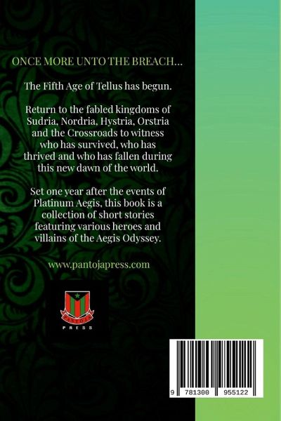 The Fifth Age of Tellus has begun. Return to the fabled kingdoms of Sudria, Nordria, Hystria, Orstria and the Crossroads to witness who has survived, who has thrived, and who has fallen during this new dawn of the world. Set one year after the events of Platinum Aegis, this book is a collection of short stories featuring various heroes and villains of the Aegis Odyssey.