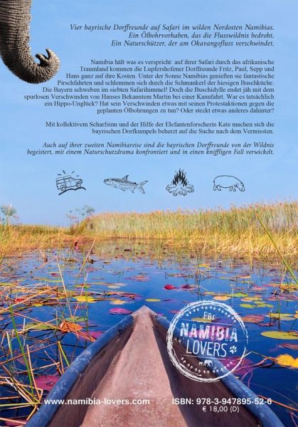 Elefanten Ekstase: Ein Gute-Laune-Namibia-Reisekrimi. Mit bayrischem Gemüt einen verschwundenen Naturschützer aufspüren: ein witzig-spannender Reiseroman. Urlaubslektüre & Geschenk für Afrika-Fans Zwischen Safari und Vermissten-Suche: Ein bayrischer Urlaubskrimi in Namibia Von Lupfershofen in die afrikanische Wildnis: Auch auf ihrer zweiten Reise durch Namibia sind die bayrischen Dorffreunde Fritz, Paul, Sepp und Hans hin und weg von der Wahnsinns-Wildnis dieses traumhaften Reiselandes. Zwischen sagenhaften Pirschfahrten und dem Genuss hiesiger Buschküchen-Schmankerl lassen sich die Kumpels die allgegenwärtige namibische Sonne auf den Bauch scheinen und schweben im siebten Safarihimmel! Doch plötzlich zerschmettert eine Unglücksnachricht die Urlaubsidylle: der Naturschützer Martin, ein Bekannter von Hans, ist bei einer Kanufahrt auf dem Okavango verschollen. Logisch, dass sich das altbewährte Ermittlerteam aus der bayerischen Provinz aufmacht, den vermissten Umweltschützer zu finden, bevor es zu spät ist! * Mehr als ein Reiseabenteuer: 4 bayrische Hobbyermittler lösen einen Fall * Witziger und spannender Roman über Namibia, Elefanten und das größte Naturschutzgebiet in Afrika * Etosha-Nationalpark und der flussreiche Nordosten Namibias: Wilde Tiere und grandiose Landschaften * Bayrische Gemütsruhe und Naturschutz-Drama: ein afrikanisches Abenteuer Der etwas andere Bayern-Krimi: auch für Nicht-Bayern ein Lesevergnügen! Krimi-Autorin Claudia du Plessis lebte selbst lange in Namibia. Ihre Begeisterung für das Land prägt dieses originelle Krimi-Reisebuch. Die vier Freunde aus dem dörflichen Fußballverein sind ebenso hingerissen von Land und Leuten - Ehrensache, dass sie sich beherzt aufmachen den vermissten Naturschützer aufzuspüren! Gehen Sie zusammen mit Fritz, Paul, Sepp und Hans auf eine turbulente Safari und fiebern Sie mit bei der Suche nach dem verschollenen Umweltschützer! PS: Kennen Sie bereits Band 1: Nashorn Nirwana von Claudia du Plessis? In diesem Namibia Reisesoftkrimi sind die vier bayrischen Dorffreunde zum ersten Mal im Reiseland Namibia auf Safari unterwegs und stolpern mitten hinein in einen Fall von Nashorn-Wilderei. Selbstredend, dass auch hier das Ermittlerteam aus der bayerischen Provinz seine Expertise einsetzt, um den Nashorn-Mördern auf die Spur zu kommen!