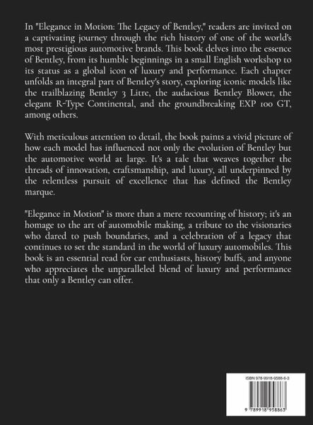 In "Elegance in Motion: The Legacy of Bentley," readers are invited on a captivating journey through the rich history of one of the world's most prestigious automotive brands. This book delves into the essence of Bentley, from its humble beginnings in a small English workshop to its status as a global icon of luxury and performance. Each chapter unfolds an integral part of Bentley's story, exploring iconic models like the trailblazing Bentley 3 Litre, the audacious Bentley Blower, the elegant R-Type Continental, and the groundbreaking EXP 100 GT, among others. With meticulous attention to detail, the book paints a vivid picture of how each model has influenced not only the evolution of Bentley but the automotive world at large. It's a tale that weaves together the threads of innovation, craftsmanship, and luxury, all underpinned by the relentless pursuit of excellence that has defined the Bentley marque. "Elegance in Motion" is more than a mere recounting of history; it's an homage to the art of automobile making, a tribute to the visionaries who dared to push boundaries, and a celebration of a legacy that continues to set the standard in the world of luxury automobiles. This book is an essential read for car enthusiasts, history buffs, and anyone who appreciates the unparalleled blend of luxury and performance that only a Bentley can offer.
