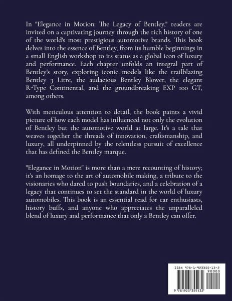 In "Elegance in Motion: The Legacy of Bentley," readers are invited on a captivating journey through the rich history of one of the world's most prestigious automotive brands. This book delves into the essence of Bentley, from its humble beginnings in a small English workshop to its status as a global icon of luxury and performance. Each chapter unfolds an integral part of Bentley's story, exploring iconic models like the trailblazing Bentley 3 Litre, the audacious Bentley Blower, the elegant R-Type Continental, and the groundbreaking EXP 100 GT, among others. With meticulous attention to detail, the book paints a vivid picture of how each model has influenced not only the evolution of Bentley but the automotive world at large. It's a tale that weaves together the threads of innovation, craftsmanship, and luxury, all underpinned by the relentless pursuit of excellence that has defined the Bentley marque. "Elegance in Motion" is more than a mere recounting of history; it's an homage to the art of automobile making, a tribute to the visionaries who dared to push boundaries, and a celebration of a legacy that continues to set the standard in the world of luxury automobiles. This book is an essential read for car enthusiasts, history buffs, and anyone who appreciates the unparalleled blend of luxury and performance that only a Bentley can offer.