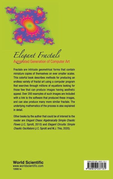 Fractals are intricate geometrical forms that contain miniature copies of themselves on ever smaller scales. This colorful book describes methods for producing an endless variety of fractal art using a computer program that searches through millions of equations looking for those few that can produce images having aesthetic appeal. Over a hundred examples of such images are included with a link to the software that produced these images, and can also produce many more similar fractals. The underlying mathematics of the process is also explained in detail. Other books by the author that could be of interest to the reader are Elegant Chaos: Algebraically Simple Chaotic Flows (J C Sprott, 2010) and Elegant Circuits: Simple Chaotic Oscillators (J C Sprott and W J Thio, 2020).