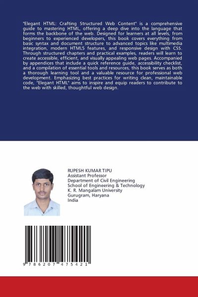 "Elegant HTML: Crafting Structured Web Content" is a comprehensive guide to mastering HTML, offering a deep dive into the language that forms the backbone of the web. Designed for learners at all levels, from beginners to experienced developers, this book covers everything from basic syntax and document structure to advanced topics like multimedia integration, modern HTML5 features, and responsive design with CSS. Through structured chapters and practical examples, readers will learn to create accessible, efficient, and visually appealing web pages. Accompanied by appendices that include a quick reference guide, accessibility checklist, and a compilation of essential tools and resources, this book serves as both a thorough learning tool and a valuable resource for professional web development. Emphasizing best practices for writing clean, maintainable code, "Elegant HTML" aims to inspire and equip readers to contribute to the web with skilled, thoughtful web design.