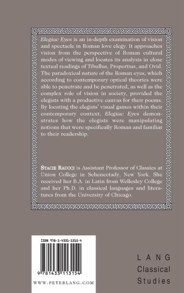 Elegiac Eyes is an in-depth examination of vision and spectacle in Roman love elegy. It approaches vision from the perspective of Roman cultural modes of viewing and locates its analysis in close textual readings of Tibullus, Propertius, and Ovid. The paradoxical nature of the Roman eyes, which according to contemporary optical theories were able to penetrate and be penetrated, as well as the complex role of vision in society, provided the elegists with a productive canvas for their poems. By locating the elegists' visual games within their contemporary context, Elegiac Eyes demonstrates how the elegists were manipulating notions that were specifically Roman and familiar to their readership.
