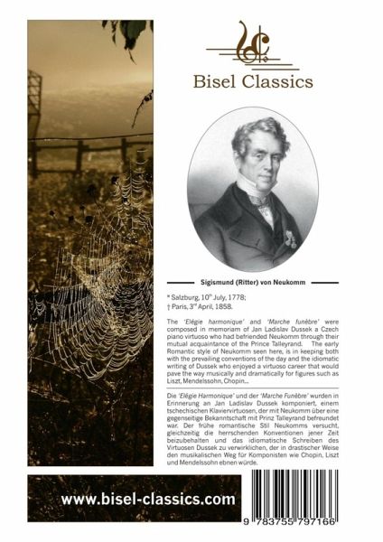 The "Elégie harmonique' and Marche funèbre' were composed in memoriam of Jan Ladislav Dussek a Czech piano virtuoso who had befriended Neukomm through their mutual acquaintance of the Prince Talleyrand. The early Romantic style of Neukomm seen here, is in keeping both with the prevailing conventions of the day and the idiomatic writing of Dussek who enjoyed a virtuoso career that would pave the way musically and dramatically for figures such as Liszt, Mendelssohn, Chopin.---Die 'Elégie Harmonique' und der 'Marche Funèbre' wurden in Erinnerung an Jan Ladislav Dussek komponiert, einem tschechischen Klaviervirtuosen, der mit Neukomm über eine gegenseitige Bekanntschaft mit Prinz Talleyrand befreundet war. Der frühe romantische Stil Neukomms versucht, gleichzeitig die herrschenden Konventionen jener Zeit beizubehalten und das idiomatische Schreiben des Virtuosen Dussek zu verwirklichen, der in drastischer Weise den musikalischen Weg für Komponisten wie Chopin, Liszt und Mendelssohn ebnen würde.