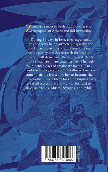 Z and Ana meet in flesh and blood at the Acropolis of Athens and fall irresistibly in love. During 19 days in love, they experience highs and lows being attracted magically and pulled apart by gender love interests. Their love for poetry and Z's research for his book on love will draw Ana, Renie, Jo, and Nefeli into a close passionate togetherness. Through the nineteen days of passionate loving, Ana could hide her preconditioned illness, but how come, Nefeli is blessed by her to become the new woman in Z's life? Does a prenuptial party reveal all secrets and show a way forward to all close friends, Muses, Nymphs, and Sybils?…mehr
