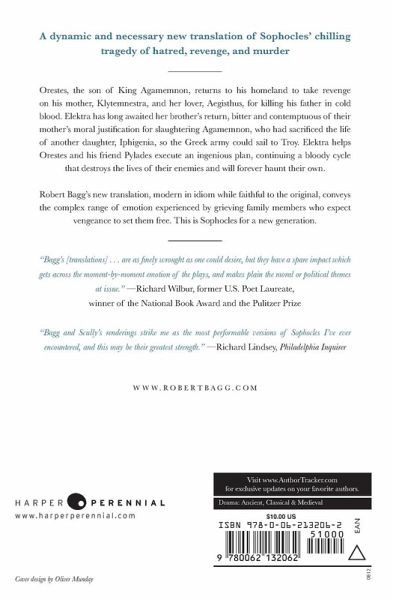 A dynamic and necessary new translation of Sophocles' chilling tragedy of hatred, revenge, and murder Orestes, the son of King Agamemnon, returns to his homeland to take revenge on his mother, Klytemnestra, and her lover, Aegisthus, for killing his father in cold blood. Elektra has long awaited her brother's return, bitter and contemptuous of their mother's moral justification for slaughtering Agamemnon, who had sacrificed the life of another daughter, Iphigenia, so the Greek army could sail to Troy. Elektra helps Orestes and his friend Pylades execute an ingenious plan, continuing a bloody cycle that destroys the lives of their enemies and will forever haunt their own. Robert Bagg's new translation, modern in idiom while faithful to the original, conveys the complex range of emotion experienced by grieving family members who expect vengeance to set them free. This is Sophocles for a new generation.