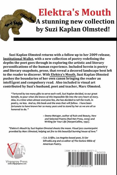 Suzi Kaplan Olmsted returns with a follow up to her 2009 release, Institutional Wallet, with a new collection of poetry redefining the depths the poet goes through in exploring the artistic and literary personifications of the human experience. Included herein is poetry and literary snapshots, prose, that reveal a decored landscape best left to the reader to discover. With Elektra's Mouth, Suzi Kaplan Olmsted pushes the boundaries of her own canon bringing the reader an intelligent and compulsory read. Also included is visual art contributed by Suzi's husband, poet and teacher, Marc Olmsted. -