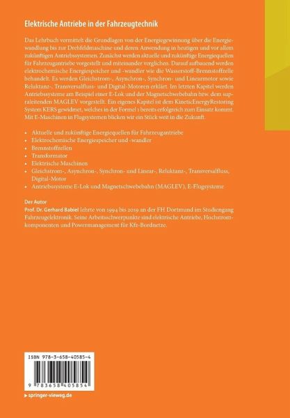 Das Lehrbuch vermittelt die Grundlagen von der Energiegewinnung über die Energiewandlung bis zur Drehfeldmaschine und deren Anwendung in heutigen und vor allem zukünftigen Antriebssystemen. Zunächst werden aktuelle und zukünftige Energiequellen für Fahrzeugantriebe vorgestellt und miteinander verglichen. Darauf aufbauend werden elektrochemische Energiespeicher und -wandler wie die Wasserstoff-Brennstoffzelle behandelt. Es werden Gleichstrom-, Asynchron-, Synchron- und Linearmotor sowie Reluktanz-, Transversalfluss- und Digital-Motoren erklärt. Im letzten Kapitel werden Antriebssysteme am Beispiel einer E-Lok und der Magnetschwebebahn bzw. dem supraleitenden MAGLEV vorgestellt. Ein eigenes Kapitel ist dem KineticEnergyRestoring System KERS gewidmet, welches in der Formel 1 bereits erfolgreich zum Einsatz kommt. Mit E-Maschinen in Flugsystemen blicken wir ein Stück weit in die Zukunft.