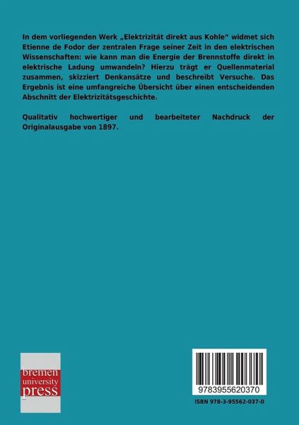 In dem vorliegenden Werk Elektrizität direkt aus Kohle widmet sich Etienne de Fodor der zentralen Frage seiner Zeit in den elektrischen Wissenschaften: wie kann man die Energie der Brennstoffe direkt in elektrische Ladung umwandeln? Hierzu trägt er Quellenmaterial zusammen, skizziert Denkansätze und beschreibt Versuche. Das Ergebnis ist eine umfangreiche Übersicht über einen entscheidenden Abschnitt der Elektrizitätsgeschichte.