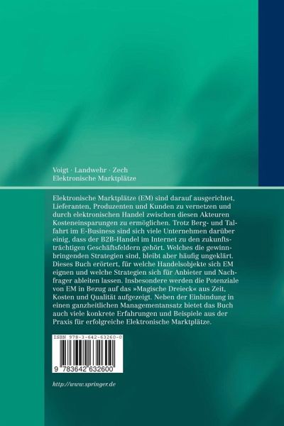 Elektronische Marktplätze (EM) sind darauf ausgerichtet, Lieferanten, Produzenten und Kunden zu vernetzen und durch elektronischen Handel zwischen diesen Akteuren Kosteneinsparungen zu ermöglichen. Trotz Berg- und Talfahrt im E-Business sind sich viele Unternehmen darüber einig, dass der B2B-Handel im Internet zu den zukunftsträchtigen Geschäftsfeldern gehört. Welches die gewinnbringenden Strategien sind bleibt aber häufig ungeklärt. Dieses Buch erörtert, für welche Handelsobjekte sich EM eignen und welche Strategien sich für Anbieter und Nachfrager ableiten lassen. Insbesondere werden die Potenziale von EM in Bezug auf das "Magische Dreieck" aus Zeit, Kosten und Qualität aufgezeigt. Neben der Einbindung in einen ganzheitlichen Managementansatz bietet das Buch auch viele konkrete Erfahrungen und Beispiele aus der Praxis für erfolgreiche Elektronische Marktplätze.