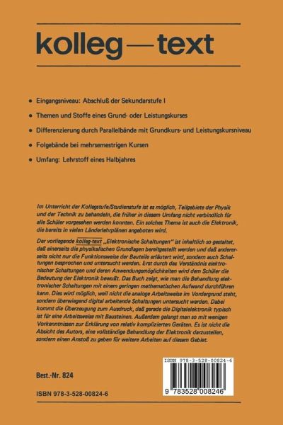 Es ist bekannt, da:B die Elektronik einen wesentlichen Beitrag zur Gestal tung der heutigen Umwelt geleistet hat. Viele Forschungsinstitute und Indu striezweige beschaftigen sich ausschlie:Blich mit elektronischen Problem en. Fast jedes elektrische Gerat, das von uns benutzt wird, enthalt einen "Hauch" von Elektronik. Die EinfUhrung der Kollegstufe/Studienstufe hat nun die Moglichkeit ergeben, auch im Unterricht Teilgebiete der Physik und Technik zu behandeln, die frtiher in diesem Umfang nicht verbindlich fiir alle Schiller vorgesehen werden konnten. Ein soiches Thema ist auch die Elektronik, das in vielen Landerlehrplanen angeboten wird und bei den Schillem meistens auf reges Interesse sto:Bt. Ein Lehrer, der einen Kurs tiber Elektronik abhalten mochte, ist vor die schwierige Aufgabe gestellt, den Kurs inhaltlich so zu gestalten, da:B einerseits die physikalischen Grundlagen hinreichend erarbeitet werden und da:B anderer seits nicht nur die Funktionsweise der Bauteile erlautertwird, sondem auch Schaltungen besprochen und untersucht werden. Erst durch das Verstandnis elektronischer Schaltungen und deren Anwendungsmoglichkeiten wird dem SchUler die Bedeutung der Elektronik bewu:Bt. Das vorliegende Buch zeigt eine Moglichkeit auf, die Behandlung elektro nischer Schaltungen mit einem geringen mathematischen Aufwand durchzu flihren. Dies wird moglich, weil nicht die analoge Arbeitsweise im Vorder grund steht, sondem tiberwiegend digital arbeitende Schaltungen untersucht werden. Dabei kommt die Dberzeugung zum Ausdruck, da:B gerade die Digital elektronik typisch ist fUr eine moderne Arbeitsweise mit Bausteinen. Au:Ber dem gelangt man so mit wenigen Vorkenntnissen zur Erklarung von relativ komplizierten Geraten.