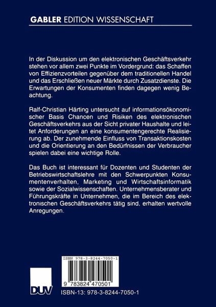 In der Diskussion um den elektronischen Geschäftsverkehr stehen vor allem zwei Punkte im Vordergrund: das Schaffen von Effizienzvorteilen gegenüber dem traditionellen Handel und das Erschließen neuer Märkte durch Zusatzdienste. Die Erwartungen der Konsumenten finden dagegen wenig Beachtung. Ralf-Christian Härting untersucht auf informationsökonomischer Basis Chancen und Risiken des elektronischen Geschäftsverkehrs aus der Sicht privater Haushalte und leitet Anforderungen an eine konsumentengerechte Realisierung ab. Der zunehmende Einfluss von Transaktionskosten und die Orientierung an den Bedürfnissen der Verbraucher spielen dabei eine wichtige Rolle.