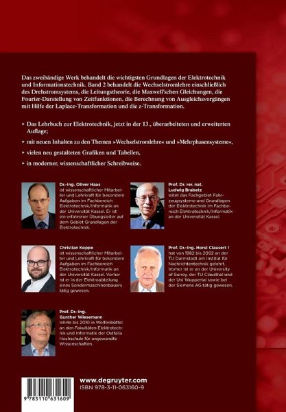 Das zweibändige Werk behandelt die wichtigsten Grundlagen der Elektrotechnik und Informationstechnik. Band 1 befasst sich im Wesentlichen mit linearen elektrischen Netzen und Operationsverstärkerschaltungen bei Gleichstrom sowie mit elektrischen und magnetischen Feldern und wendet sich an Leser, die mit den Grundbegriffen der Differential- und Integralrechnung vertraut sind; anspruchsvollere Hilfsmittel der Feldtheorie werden im Text erläutert. Band 2 behandelt die Wechselstromlehre einschließlich des Drehstromsystems, die Leitungstheorie, die Maxwellschen Gleichungen, die Fourier-Darstellung von Zeitfunktionen, die Berechnung von Ausgleichsvorgängen mit Hilfe der Laplace-Transformation und die Z-Transformation.