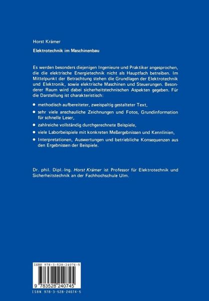 1 Grundbegriffe.- 1.1 Elektrische Ladung.- 1.2 Elektrische Spannung.- 1.3 Elektrischer Strom.- 1.4 Elektrische Leistung und Arbeit.- 1.5 Elektrischer Widerstand.- 1.6 Das Ohmsche Gesetz.- 2 Komponenten elektrischer Anlagen.- 2.1 Verbindungselemente.- 2.2 Stromwege.- 2.3 Überstrom-und Fehlerstrom-Schutzeinrichtungen.- 2.4 Schalter.- 2.5 Spulen.- 2.6 Kondensatoren.- 2.7 Halbleiterbauelemente.- 2.8 Meßgeräte mit Zeigern und Ziffern.- 2.9 Oszilloskop.- 2.10 Quellen.- 3 Elektrische Stromkreise.- 3.1 Erklärung.- 3.2 Das Ersatzschaltbild.- 3.3 Technischer Stromrichtungssinn.- 3.4 Erzeuger-, Speicher- und Verbraucher-Kriterium.- 4 Gleichstromkreise mit linearen Komponenten.- 4.1 Erklärung.- 4.2 Reihenschaltung.- 4.3 Parallelschaltung.- 4.4 Gemischte Schaltungen.- 5 Gleichstromkreise mit nichtlinearen Komponenten.- 5.1 Reihenschaltungen nichtlinear.- 5.2 Parallelschaltungen nichtlinear.- 5.3 Gemischte Schaltungen nichtlinear.- 5.4 Elektronische Komponenten.- 6 Felder.- 6.1 Allgemeines.- 6.2 Grundgrößen und Richtungsnormen.- 6.3 Felddichte.- 6.4 Feldstärke.- 6.5 Feldkonstante.- 6.6 Materialgleichungen.- 6.7 Ohmsches Gesetz.- 6.8 Kapazität und Induktivität.- 6.9 Ladestrom und Induktionsvorgang.- 6.10 Schaltungen von Kondensatoren.- 6.11 Schaltungen von Spulen.- 6.12 Schaltvorgänge.- 6.13 Zeitkonstante.- 6.14 Induktionsvorgänge.- 6.15 Kräfte im magnetischen Feld.- 7 Wechselstromkreise.- 7.1 Allgemeines.- 7.2 Darstellungsarten, Formalien und Vereinbarungen.- 7.3 Wechselstromleistung; Effektivwert.- 7.4 Wechselstromverbraucher einzeln.- 7.5 Wechselstromverbraucher in Reihe.- 7.6 Wechselstromverbraucher in Parallelschaltung.- 7.7 Wechselstromverbraucher in gemischter Schaltung.- 7.8 Wirk-, Blind-und Scheinleistung; graphische Darstellung.- 7.9 Wirk-, Blind- undScheinleistung; rechnerische Behandlung.- 7.10 Blindleistungskompensation.- 7.11 Spannungsabfall auf elektrischen Stromwegen.- 7.12 Drosselspulen.- 7.13 Einschaltvorgänge bei Drosselspulen.- 8 Dreiphasenwechselstrom (Drehstrom).- 8.1 Entstehung; Allgemeines.- 8.2 Schaltungen allgemein.- 8.3 Sternschaltung (Y-Schaltung).- 8.4 Dreieckschaltung (A-Schaltung).- 8.5 Drehstromleistung.- 8.6 Netzstromvergleich zwischen Y- und A-Schaltung.- 8.7 Zulässige Schaltungen.- 8.8 Blindleistungskompensation bei Drehstromanlagen.- 8.9 Spannungsabfall bei Drehstrom.- 8.10 Drehstrom-Netzformen.- 8.11 Berührungsschutz in Drehstrom-Netzen.- 9 Transformator (Trafo, Umspanner).- 9.1 Aufgabe, Aufbau und Bauformen.- 9.2 Wirkungsweise.- 9.3 Übersetzung.- 9.4 Belastung.- 9.5 Kenndaten.- 9.6 Kurzschluß.- 9.7 Spannungsabfall bei Belastung.- 9.8 Spezielle Aufgabenstellungen von Trafos.- 10 Stromrichter.- 10.1 Erklärung.- 10.2 Gleichrichter.- 10.3 Wechselrichter.- 10.4 Umrichter.- 11 Elektrische Maschinen allgemein.- 11.1 Übersicht über die einzelnen Maschinenarten.- 11.2 Mechanische Gemeinsamkeiten bei elektrischen Maschinen.- 11.3 Gemeinsamkeiten bei Motorkennlinien.- 11.4 Elektrische Gemeinsamkeiten.- 11.5 Gemeinsamkeiten bei Fehlbedienung.- 12 Gemeinsamkeiten bei Drehfeldmaschinen.- 12.1 Drehfelder.- 12.2 Ständerwicklungen von Drehfeldmaschinen.- 12.3 Beziehung zwischen Dreh- und Wechselfeldern.- 12.4 Umsteuern von Drehfeldmaschinen.- 12.5 Wanderfeld.- 12.6 Drehfeldleistung (Blindleistung).- 13 Asynchronmaschine (Induktionsmaschine).- 13.1 Konstruktive Abgrenzung.- 13.2 Wirkungsweise der Asynchronmaschine.- 13.3 Anlauf der Asynchronmaschine.- 13.4 Drehzahlsteuerung von Asynchronmaschinen.- 13.5 Bremsen der Asynchronmaschine.- 14 Synchronmaschine.- 14.1 Konstruktive Abgrenzung.- 14.2Wirkungsweise der Synchronmaschine.- 14.3 Phasenschieberbetrieb.- 14.4 Generator-Inbetriebnahme; Synchronisierung.- 15 Gemeinsamkeiten bei Stromwendermaschinen.- 15.1 Ständer von Stromwendermaschinen.- 15.2 Läufer von Stromwendermaschinen.- 15.3 Ankerwicklungen bei Stromwendermaschinen.- 15.4 Schaltungen und Klemmenbezeichnungen von Stromwendermaschinen.- 15.5 Wendepol- und Kompensationswicklung.- 15.6 Umsteuern