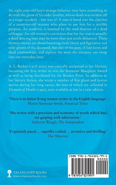 An eight-year-old boy's strange behavior may have something to do with the ghost of his older brother, whose death was written off as a tragic accident - but was it? A man is lured into the clutches of a centuries-old woman who plans to use him for a terrible purpose. An academic is haunted by the mad theories of a dead colleague. An old woman's conviction that her fur coat is actually a dead dancing bear may be more than just senile delusions. These thirteen stories are about hauntings both literal and figurative: not only ghosts of the deceased, but also of the past, of lost loves and dead relationships, and explore the ways the uncanny can creep into our everyday lives. A. L. Barker (1918-2002) was critically acclaimed in her lifetime, becoming the first writer to win the Somerset Maugham Award as well as being shortlisted for the Booker Prize. In addition to her literary fiction, she wrote a number of fine ghost and horror stories during her long career, the best of which are collected in Element of Doubt (1992), now available at last in a new edition. 'There is no better living woman writer in the English language.' - Martin Seymour-Smith, Financial Times 'She writes with a precision and economy of words which had me gasping with admiration.' - Auberon Waugh, The Independent 'Exquisitely paced . . . superbly crafted . . . inventive and thrilling.' - The Observer