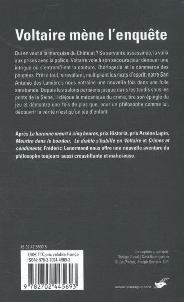 Voltaire mene l'enquete Qui en veut a la marquise du Chatelet ? Sa servante assassinee, la voila aux prises avec la police. Voltaire vole a son secours pour denouer une intrigue ou s'entremelent la couture, l'horlogerie et le commerce des poupees. Pret a tout, virevoltant, multipliant les mots d'esprit, notre San Antonio des Lumieres nous entraine une nouvelle fois dans une folle sarabande. Depuis les salons parisiens jusque dans les taudis sous les ponts de la Seine, il dejoue la mecanique du crime, tire son epingle du jeu et demontre une fois de plus que, pour un philosophe comme lui, decouvrir la verite n'est qu'un jeu d'enfant.