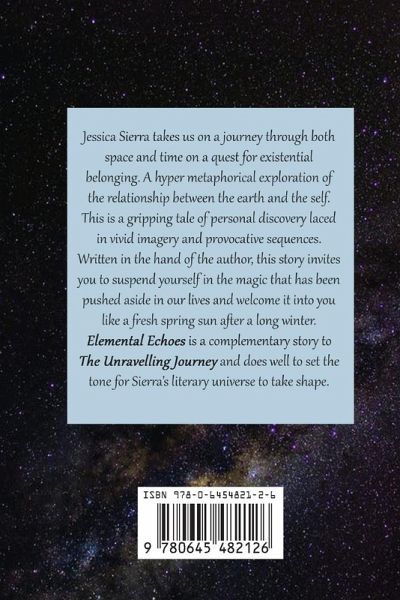 Jessica Sierra takes us on a journey through both space and time on a quest for existential belonging. A hyper metaphorical exploration of the relationship between the earth and the self. This is a gripping tale of personal discovery laced in vivid imagery and provocative sequences. Written in the hand of the author, this story invites you to suspend yourself in the magic that has been pushed aside in our lives and welcome it into you like a fresh spring sun after a long winter. Elemental Echoes is a complementary story to The Unravelling Journey and does well to set the tone for Sierra's literary universe to take shape.