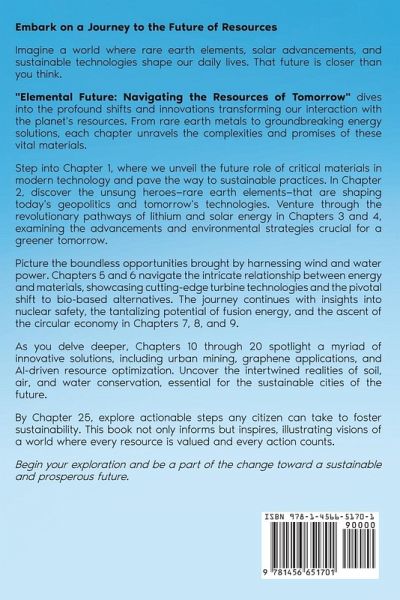 Embark on a Journey to the Future of Resources Imagine a world where rare earth elements, solar advancements, and sustainable technologies shape our daily lives. That future is closer than you think. "Elemental Future: Navigating the Resources of Tomorrow" dives into the profound shifts and innovations transforming our interaction with the planet's resources. From rare earth metals to groundbreaking energy solutions, each chapter unravels the complexities and promises of these vital materials. Step into Chapter 1, where we unveil the future role of critical materials in modern technology and pave the way to sustainable practices. In Chapter 2, discover the unsung heroes-rare earth elements-that are shaping today's geopolitics and tomorrow's technologies. Venture through the revolutionary pathways of lithium and solar energy in Chapters 3 and 4, examining the advancements and environmental strategies crucial for a greener tomorrow. Picture the boundless opportunities brought by harnessing wind and water power. Chapters 5 and 6 navigate the intricate relationship between energy and materials, showcasing cutting-edge turbine technologies and the pivotal shift to bio-based alternatives. The journey continues with insights into nuclear safety, the tantalizing potential of fusion energy, and the ascent of the circular economy in Chapters 7, 8, and 9. As you delve deeper, Chapters 10 through 20 spotlight a myriad of innovative solutions, including urban mining, graphene applications, and AI-driven resource optimization. Uncover the intertwined realities of soil, air, and water conservation, essential for the sustainable cities of the future. By Chapter 25, explore actionable steps any citizen can take to foster sustainability. This book not only informs but inspires, illustrating visions of a world where every resource is valued and every action counts. Begin your exploration and be a part of the change toward a sustainable and prosperous future.