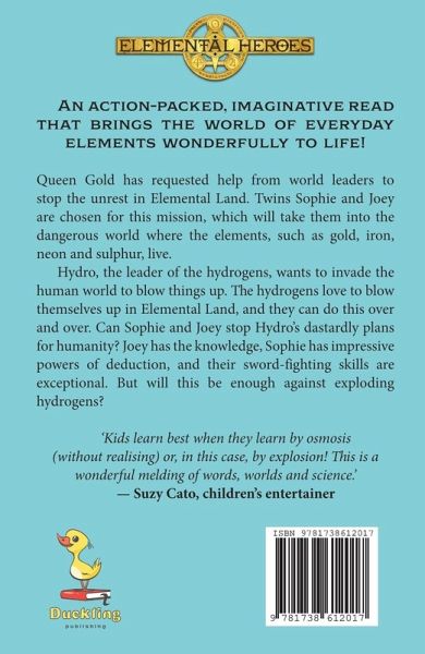 An action-packed, imaginative read that brings the world of everyday elements wonderfully to life! Queen Gold has requested help from the world leaders to stop the unrest that is happening in Elemental Land. Twins Sophie and Joey are chosen for this mission that will take them into the dangerous world where the elements, such as gold, iron, neon and sulphur, live. Hydro, the leader of the hydrogens, wants to invade the human world to blow things up. The hydrogens love to blow themselves up in Elemental Land, and they can do this over and over. Can Sophie and Joey stop Hydro's dastardly plans for humanity? Joey has the knowledge, Sophie has impressive powers of deduction, and their sword-fighting skills are exceptional. But will this be enough against exploding hydrogens?