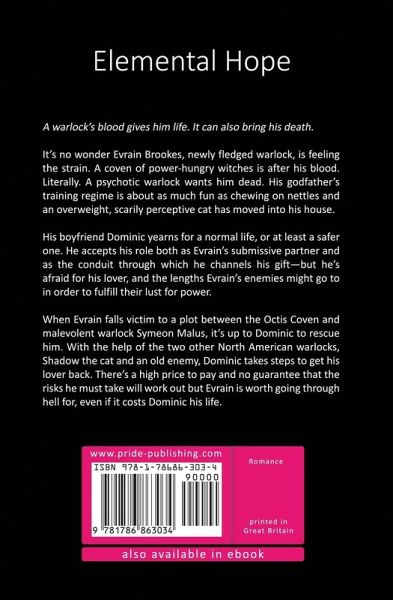 A warlock's blood gives him life. It can also bring his death. It's no wonder Evrain Brookes, newly fledged warlock, is feeling the strain. A coven of power-hungry witches is after his blood. Literally. A psychotic warlock wants him dead. His godfather's training regime is about as much fun as chewing on nettles and an overweight, scarily perceptive cat has moved into his house. His boyfriend Dominic yearns for a normal life, or at least a safer one. He accepts his role both as Evrain's submissive partner and as the conduit through which he channels his gift-but he's afraid for his lover, and the lengths Evrain's enemies might go to in order to fulfill their lust for power. When Evrain falls victim to a plot between the Octis Coven and malevolent warlock Symeon Malus, it's up to Dominic to rescue him. With the help of the two other North American warlocks, Shadow the cat and an old enemy, Dominic takes steps to get his lover back. There's a high price to pay and no guarantee that the risks he must take will work out but Evrain is worth going through hell for, even if it costs Dominic his life.