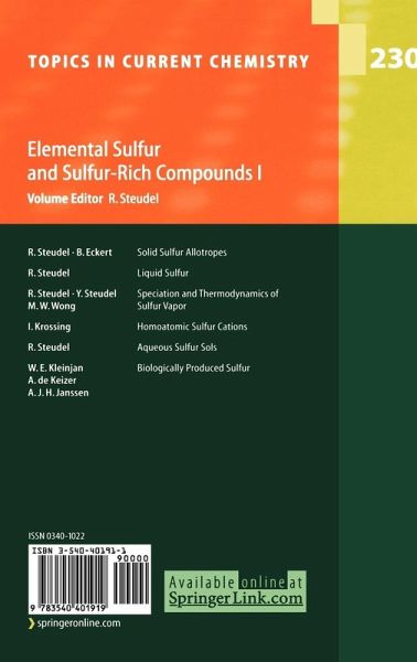 R. Steudel, B. Eckert: Solid Sulfur Allotropes.- R. Steudel: Liquid Sulfur.- R. Steudel, Y. Steudel, M.W. Wong: Speciation and Thermodynamics of Sulfur Vapor.- I. Krossing: Homoatomic Sulfur Cations.- R. Steudel: Aqueous Sulfur Sols.- W.E. Kleinjan, A. de Keizer, A. J. H. Janssen: Biologically Produced Sulfur.