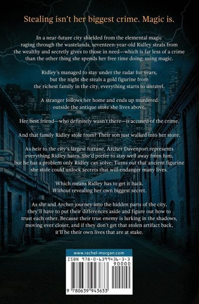 Stealing isn't her biggest crime. Magic is. In a near-future city shielded from the elemental magic raging through the wastelands, seventeen-year-old Ridley steals from the wealthy and secretly gives to those in need—which is far less of a crime than the other thing she spends her free time doing: using magic. Ridley's managed to stay under the radar for years, but the night she steals a gold figurine from the richest family in the city, everything starts to unravel. A stranger follows her home and ends up murdered outside the antique store she lives above. Her best friend—who definitely wasn't there—is accused of the crime. And that family Ridley stole from? Their son just walked into her store. As heir to the city's largest fortune, Archer Davenport represents everything Ridley hates. She'd prefer to stay well away from him, but he has a problem only Ridley can solve: Turns out that ancient figurine she stole could unlock secrets that will endanger many lives. Which means Ridley has to get it back. Without revealing her own biggest secret. As she and Archer journey into the hidden parts of the city, they'll have to put their differences aside and figure out how to trust each other. Because their true enemy is lurking in the shadows, moving ever closer, and if they don't get that stolen artifact back, it'll be their own lives that are at stake.