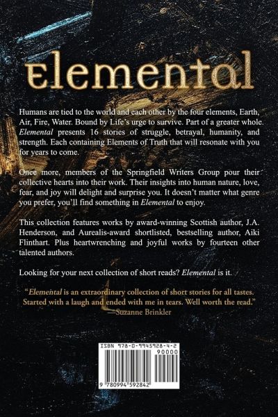 Humans are one with this world. Part of a greater whole. Tied by the four elements, Earth, Air, Fire, Water. Bound by Life's urge to survive. Elemental presents 16 stories of struggle, betrayal, humanity, and strength. Each containing Elements of Truth that will resonate with you for years to come. Once more, members of the Springfield Writers Group pour their collective hearts into their work. Their insights into human nature, love, fear and joy will delight and surprise you. It doesn't matter what genre you prefer, you'll find something in Elemental to enjoy. This collection features works by award-winning Scottish author, JA Henderson, and Aurealis-award shortlisted and Amazon best-selling author, Aiki Flinthart. Plus heartwrenching and joyful works by fourteen other talented authors. Looking for your next collection of short reads? Elemental is it.