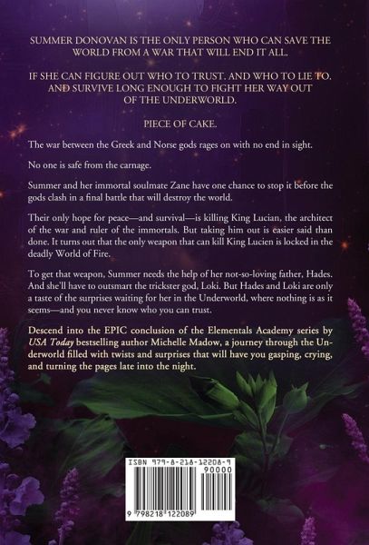 Summer Donovan is the only person who can save the world from a war that will end it all. If she can figure out who to trust. And who to lie to. And survive long enough to fight her way out of the Underworld. Piece of cake. The war between the Greek and Norse gods rages on with no end in sight. No one is safe from the carnage. Summer and her immortal soulmate Zane have one chance to stop it before the gods clash in a final battle that will destroy the world. Their only hope for peace-and survival-is killing King Lucian, the architect of the war and ruler of the immortals. But taking him out is easier said than done. It turns out that the only weapon that can kill King Lucien is locked in the deadly World of Fire. To get that weapon, Summer needs the help of her not-so-loving father, Hades. And she'll have to outsmart the trickster god, Loki. But Hades and Loki are only a taste of the surprises waiting for her in the Underworld, where nothing is as it seems-and you never know who you can trust. Descend into the EPIC conclusion of the Elementals Academy series by USA Today bestselling author Michelle Madow, a journey through the Underworld filled with twists and surprises that will have you gasping, crying, and turning the pages late into the night.