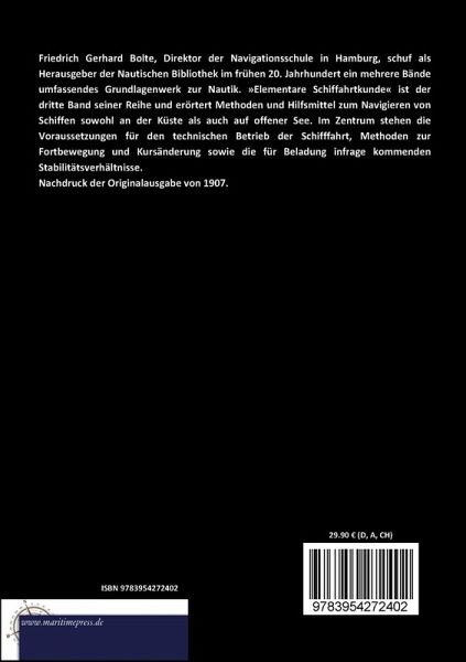 Friedrich Gerhard Bolte, Direktor der Navigationsschule in Hamburg, schuf als Herausgeber der Nautischen Bibliothek im frühen 20. Jahrhundert ein mehrere Bände umfassendes Grundlagenwerk zur Nautik. "Elementare Schiffahrtkunde" ist der dritte Band seiner Reihe und erörtert Methoden und Hilfsmittel zum Navigieren von Schiffen sowohl an der Küste als auch auf offener See. Im Zentrum stehen die Voraussetzungen für den technischen Betrieb der Schifffahrt, Methoden zur Fortbewegung und Kursänderung sowie die für Beladung infrage kommenden Stabilitätsverhältnisse.