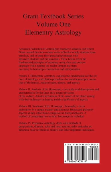 American Federation of Astrologers founders Catharine and Ernest Grant created this four volume series of books to help students learn astrology and to share their practical techniques with advanced students and professionals. These books cover the fundamental principles of astrology using clear and concise language while guiding the reader through the steps necessary to horoscope construction and interpretation. Volume I, Elementary Astrology of the Horoscope, explains the fundamentals of the science of astrology, calculation procedures for natal horoscopes, meanings of the houses, zodiacal signs, planets and aspects. Volume II, Analysis of the Horoscope, covers physical descriptions and characteristics for the faces (five-degree divisions of the zodiac), detailed definitions of the nature of the planets along with their influence in houses and the significance of aspects. Volume III, Synthesis of the Horoscope, thoroughly covers delineation in a unique manner and discusses houses and planetary aspects as they affect basic human complexes in human behavior. A method of comparing two or more horoscopes is included. Volume IV, Predictive Astrology, deals with the methods of progressions, diurnals. solar and lunar returns, radix and solar arc direction, solar revolutions, transits and other important techniques.