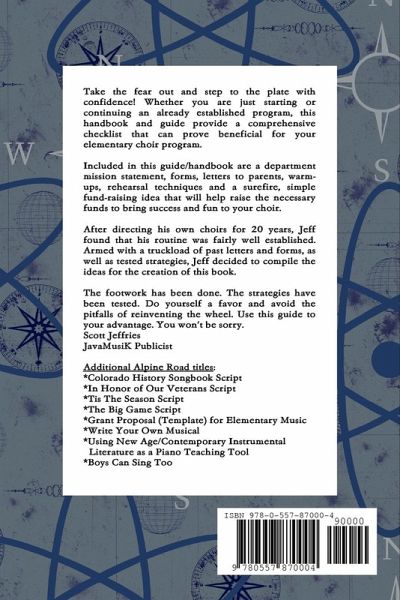 Take the fear out & step up to the plate w/ confidence! Whether just starting or continuing an already established choir, this handbook/guide provide a beneficial checklist. Included are a dept. mission statement, forms, letters to parents, warm-ups, rehearsal techniques & a simple fund-raising idea to bring necessary funds to your program. After directing his own choirs for 20 years, Jeff found that his routine was fairly well established. Armed with a truckload of past letters & forms, as well as tested strategies, Jeff decided to compile the ideas for the creation of this book. The footwork has been done. The strategies have been tested. Do yourself a favor and avoid the pitfalls of reinventing the wheel. Use this guide to your advantage. You won't be sorry. Scott Jeffries JavaMusiK Publicist