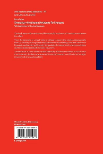 Preface.- Introduction.- I Continuum Mechanics.- II Specialized Continua.- III Beams with Cross-Sections and Plates with Thickness.- IV Buckling.- V Introduction to the Finite Element Method.- VI Mathematical Preliminaries.- Index.