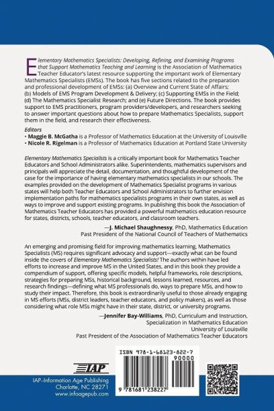 Elementary mathematics specialists are teacher leaders who are responsible for supporting effective PK-6 mathematics instruction and student learning. The Association of Mathematics Teacher Educators (AMTE), the Association of State Supervisors of Mathematics, the National Council of Supervisors of Mathematics, and the National Council of Teachers of Mathematics, in a 2010 joint position paper on Elementary Mathematics Specialists (EMSs), all advocate for the use of EMSs to support the teaching and learning of mathematics. The specific roles and expectations of EMSs will vary according to the needs of each setting, "but their expertise and successful experience at the elementary level is critical" (p 1). Elementary Mathematics Specialists: Developing, Refining, and Examining Programs that Support Mathematics Teaching and Learning is AMTE's latest resource supporting the important work of EMSs. It has five sections related to the preparation and professional development of EMSs: (a) Overview and Current State of Affairs; (b) Models of EMS Program Development & Delivery; (c) Supporting EMSs in the Field; (d) The Mathematics Specialist Research; and (e) Future Directions. The book provides support to EMS practitioners, program providers/developers, and researchers seeking to answer important questions about how to prepare Mathematics Specialists, support them in the field, and research their effectiveness.
