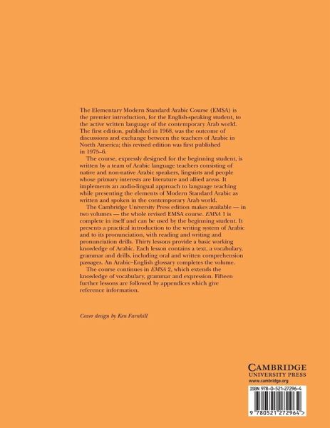 The Elementary Modern Standard Arabic Course (EMSA) is the premier introduction, for the English-speaking student, to the active written language of the contemporary Arab world. Expressly designed for the beginning student, the course is written by a team of Arabic language teachers consisting of native and non-native Arabic speakers, linguists and people whose primary interests are literature and allied areas. It implements an audio-lingual approach to language teaching while presenting the elements of Modern Standard Arabic as written and spoken in the contemporary Arab World. Volume 1 is complete in itself and presents a practical introduction to the writing system of Arabic and to its pronunciation, with reading and writing pronunciation drills. Thirty lessons provide a basic working knowledge of Arabic. Each lesson contains a text, a vocabulary, grammar and drills including oral and written comprehension passages. An Arabic-English glossary completes the volume. The co