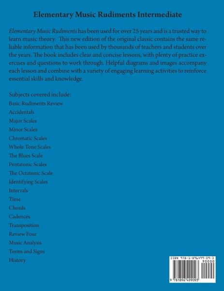 Elementary Music Rudiments Intermediate has been used for over 25 years and is a trusted way to learn music theory. This new edition of the original classic contains the same reliable information that has been used by thousands of teachers and students over the years. The book includes clear and concise lessons, with plenty of practice exercises and questions to work through. Helpful diagrams and images accompany each lesson and combine with a variety of engaging learning activities to reinforce essential skills and knowledge.