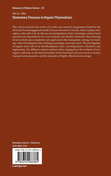 This volume presents the results of a multi-year research programme funded by the Deutsche Forschungsgemeinschaft (German Research Council), which explains how organic solar cells work. In this new promising photovoltaic technology, carbon-based materials are deposited by low-cost methods onto flexible substrates, thus allowing devices which open completely new applications like transparent coatings for building, solar cells integrated into clothing or packages, and many more. The investigation of organic solar cells is an interdisciplinary topic, covering physics, chemistry and engineering. The different chapters address topics ranging from the synthesis of new organic materials, to the characterization of the elementary processes such as exciton transport and separation, and the principles of highly efficient device design.