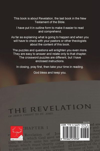 This book is about Revelation, the last book in the New Testament of the Bible. I have put it in outline form to make it easier to read and comprehend As far as explaining what is going to happen and when you will have to check with your pastors or other theologists about the content of this book. The puzzles and questions will enlighten you even more. They are easy to answer and relate only to that chapter. The crossword puzzles are different, but I have enclosed instructions. In closing, pray first, then take your time in reading. God bless and keep you.