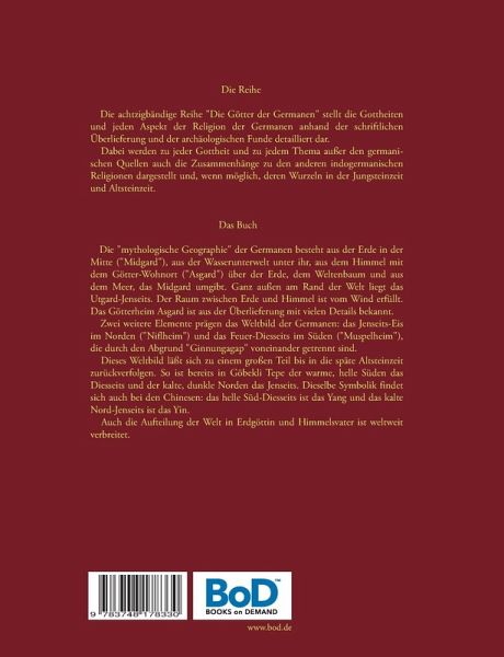 Die ReiheDie achtzigbändige Reihe "Die Götter der Germanen" stellt die Gottheiten und jeden Aspekt der Religion der Germanen anhand der schriftlichen Überlieferung und der archäologischen Funde detailliert dar.Dabei werden zu jeder Gottheit und zu jedem Thema außer den germanischen Quellen auch die Zusammenhänge zu den anderen indogermanischen Religionen dargestellt und, wenn möglich, deren Wurzeln in der Jungsteinzeit und Altsteinzeit.Das BuchDie "mythologische Geographie" der Germanen besteht aus der Erde in der Mitte ("Midgard"), aus der Wasserunterwelt unter ihr, aus dem Himmel mit dem Götter-Wohnort ("Asgard") über der Erde, und aus dem Meer, das Midgard umgibt. Ganz außen am Rand der Welt liegt das Utgard-Jenseits. Der Raum zwischen Erde und Himmel ist vom Wind erfüllt. Das Götterheim Asgard ist aus der Überlieferung mit vielen Details bekannt.Zwei weitere Elemente prägen das Weltbild der Germanen: das Jenseits-Eis im Norden ("Niflheim") und das Feuer-Diesseits im Süden ("Muspelheim"), die durch den Abgrund "Ginnungagap" voneinander getrennt sind.Dieses Weltbild lässt sich zu einem großen Teil bis in die späte Altsteinzeit zurückverfolgen. So ist bereits in Göbekli Tepe der warme, helle Süden das Diesseits und der kalte, dunkle Norden das Jenseits. Dieselbe Symbolik findet sich auch bei den Chinesen: das helle Süd-Diesseits ist das Yang und das kalte Nord-Jenseits ist das Yin.Auch die Aufteilung der Welt in Erdgöttin und Himmelsvater ist weltweit verbreitet.