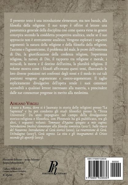 Il presente testo è una introduzione elementare, ma non banale, alla filosofia della religione. Il suo scopo è offrire al lettore una panoramica generale della disciplina così come questa viene in genere concepita secondo la cosiddetta prospettiva analitica, anche se il suo approccio non è strettamente analitico. Vengono esplorati i seguenti argomenti: la natura della religione e della filosofia della religione, l'ateismo e l'agnosticismo, il problema del male, le prove dell'esistenza di Dio, la giustificazione della credenza religiosa, l'esperienza religiosa, la natura di Dio, il rapporto tra religione e morale, i miracoli, la morte e il destino dell'anima, la pluralità religiosa. Il volume mostra come i filosofi affrontano questi temi, illustrando le loro diverse posizioni nei confronti degli stessi e il modo in cui tali posizioni vengono argomentate e contro-argomentate. Il taglio esplicitamente divulgativo dell'opera rende i suoi contenuti accessibili a qualsiasi lettore interessato alla materia, a prescindere dalle sue conoscenze pregresse in merito alla medesima. .
