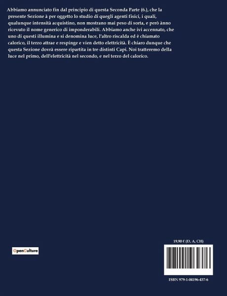 Abbiamo annunciato fin dal principio di questa Seconda Parte (6.), che la presente Sezione à per oggetto lo studio di quegli agenti fisici, i quali, qualunque intensità acquistino, non mostrano mai peso di sorta, e però ànno ricevuto il nome generico di imponderabili. Abbiamo anche ivi accennato, che uno di questi illumina e si denomina luce, l'altro riscalda ed è chiamato calorico, il terzo attrae e respinge e vien detto elettricità. È chiaro dunque che questa Sezione dovrà essere ripartita in tre distinti Capi. Noi tratteremo della luce nel primo, dell'elettricità nel secondo, e nel terzo del calorico.