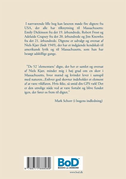 "Elementære digte" indeholder 52 digte af Emily Dickinson, Robert Frost, Adelaide Crapsey og Jim Knowles, der alle har tilknytning til Massachusetts, USA. Digtene er udvalgt og oversat af Niels Kjær, der har et indgående kendskab til amerikansk lyrik og til Massachusetts, som han har besøgt adskillige gange.